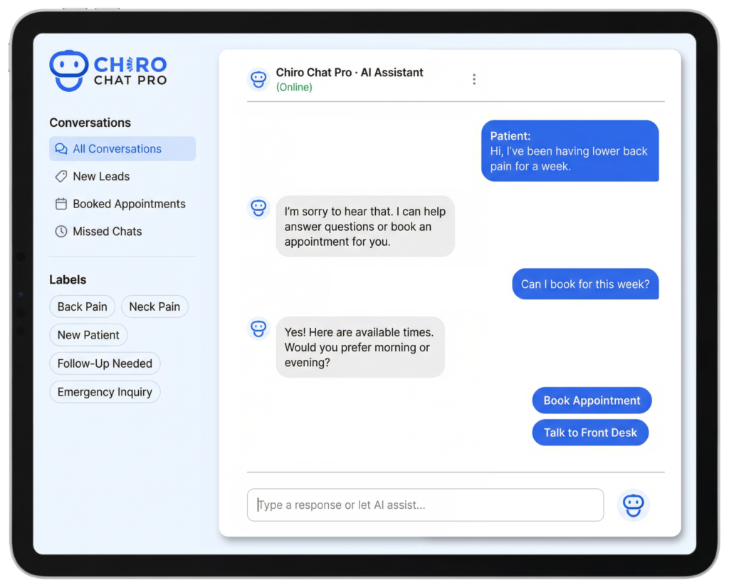 “Since integrating ChiroChatPro on our site, we’ve noticed more appointment requests and better patient interaction. It’s intuitive, professional, and really understands chiropractic terminology.”
